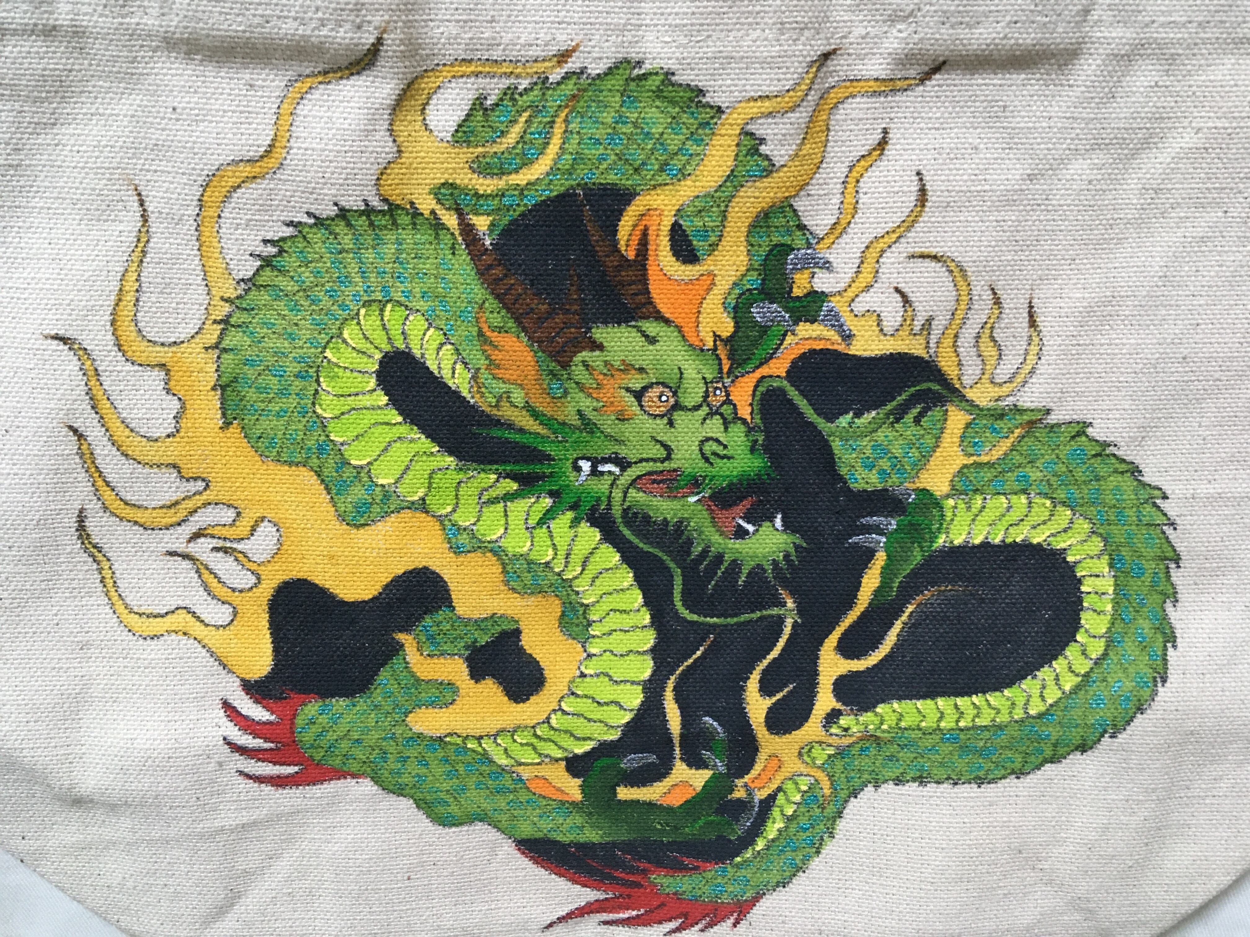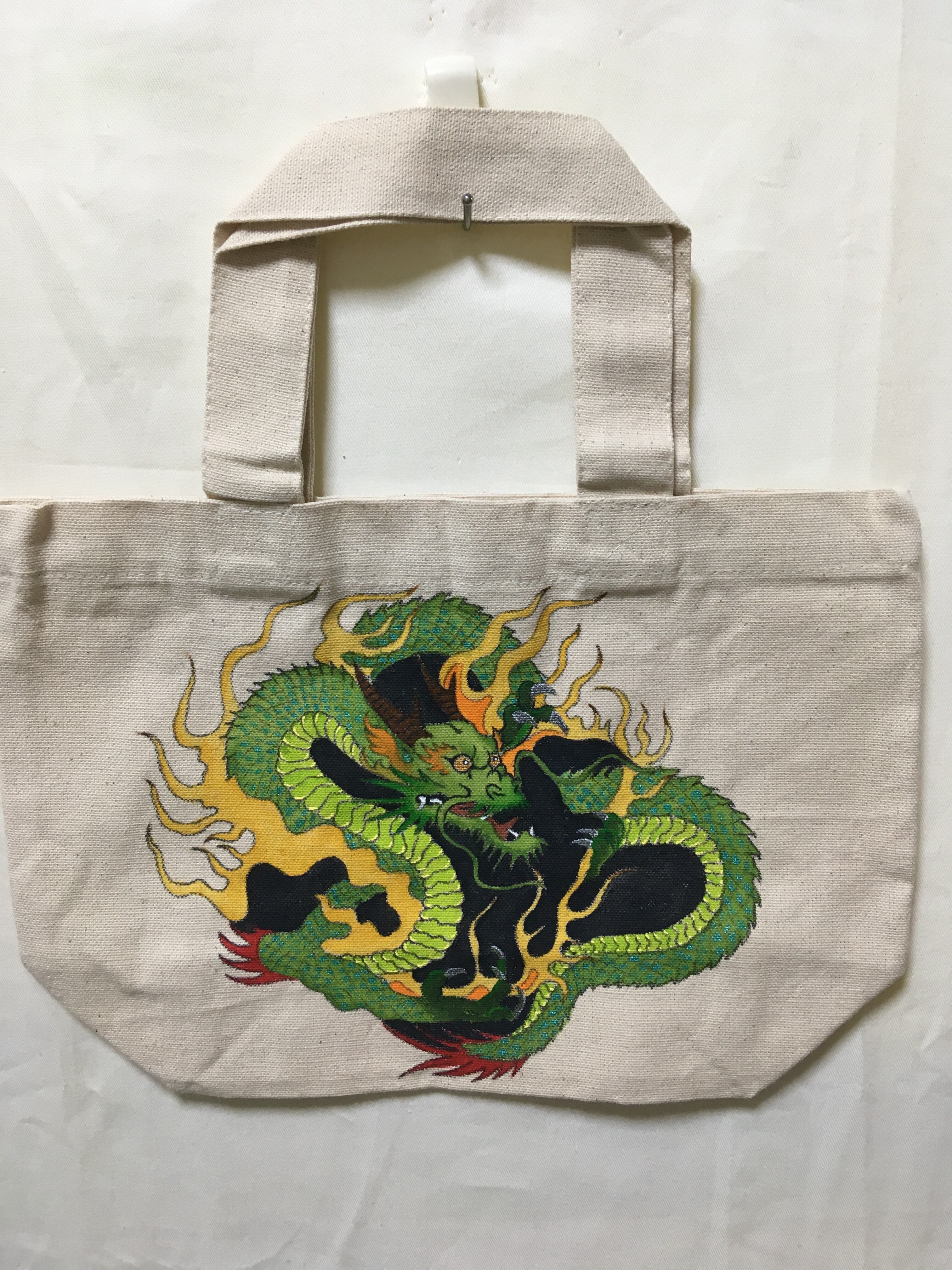 厚めの生地で下地の色味を活かし手書きで龍を描き、丁寧に仕上がっています。ちょっと外出する際ランチバッグとしても使えます。犬の散歩にも便利です。