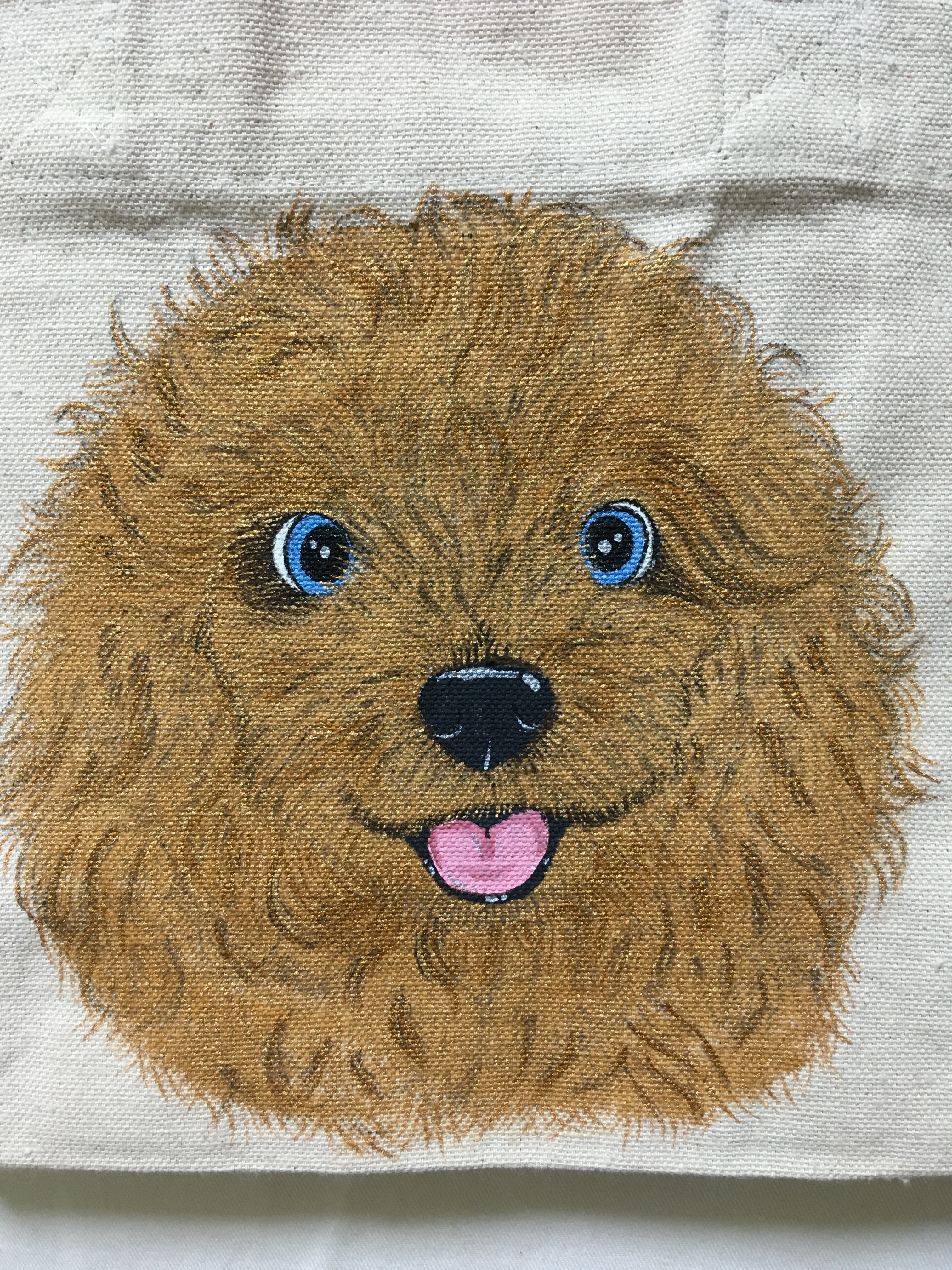 厚めの生地で下地の色味を活かし手書きでプードルを描き、丁寧に仕上がっています。ちょっと外出する際ランチバッグとしても使えます。犬の散歩にも便利です。