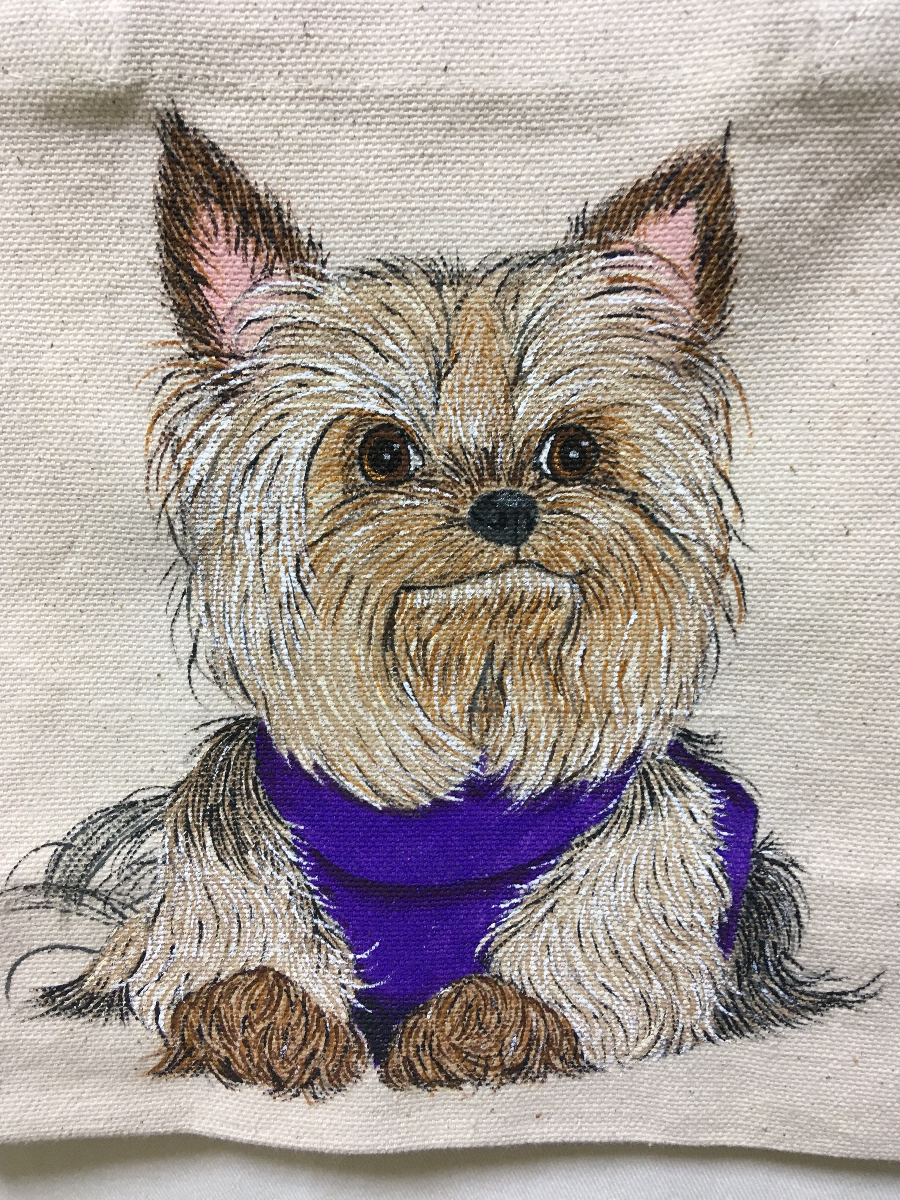 厚めの生地で下地の色味を活かし手書きでヨークシャーテリアを描き、丁寧に仕上がっています。ちょっと外出する際ランチバッグとしても使えます。犬の散歩にも便利です。
